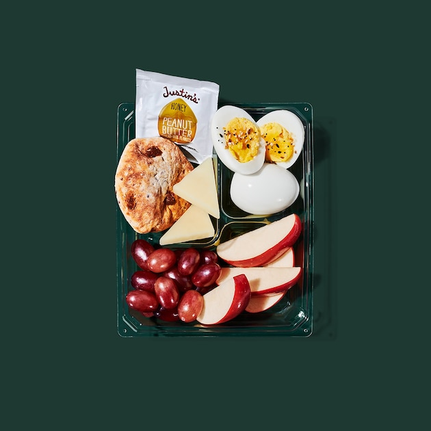 Two cage-free hard-boiled eggs, sliced tart apples, grapes and white Cheddar cheese come together with multigrain muesli bread and honey peanut butter.